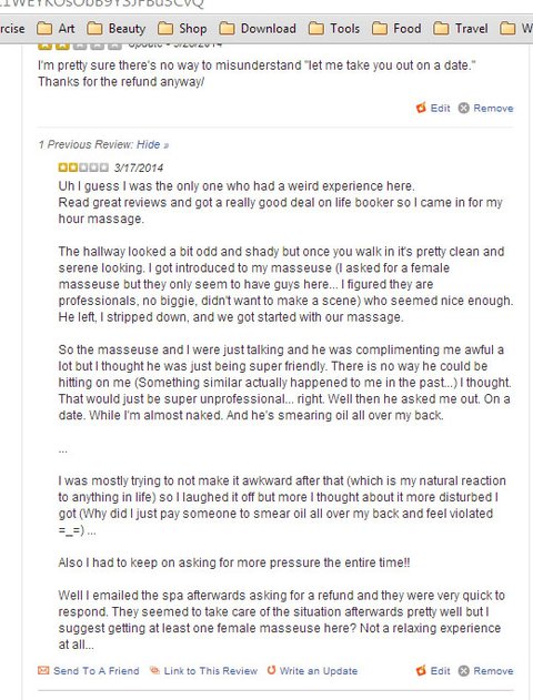 "어제 너네 마사지사가 나에게 데이트 신청을 했다. 굉장히 프로답지 못한 모습이였다. 패키지로 사놨는데 다시 못 돌아갈꺼 같으니 리펀드를 해달라."