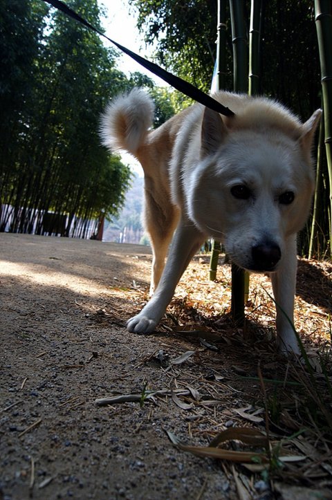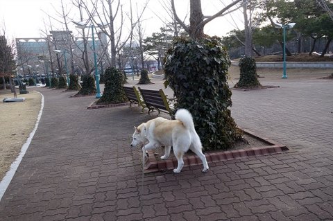 킁킁 냄새 맡으면서 산책하고 있어요