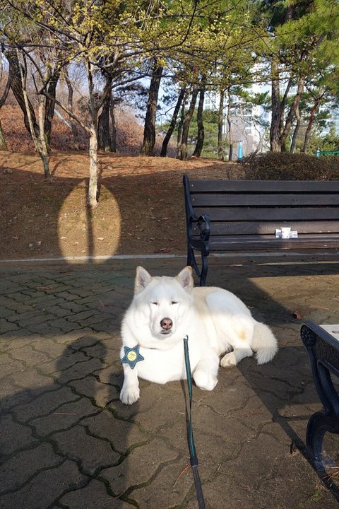 잠시 자판기 음료 사는 동안 벤치 앞에서 심바가 쉬고 있는데요.