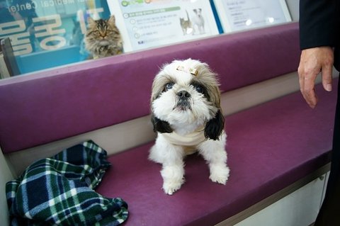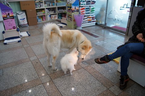 동물병원에 놀러온 심바 작은 시츄 친구에게 인사하고 있어요