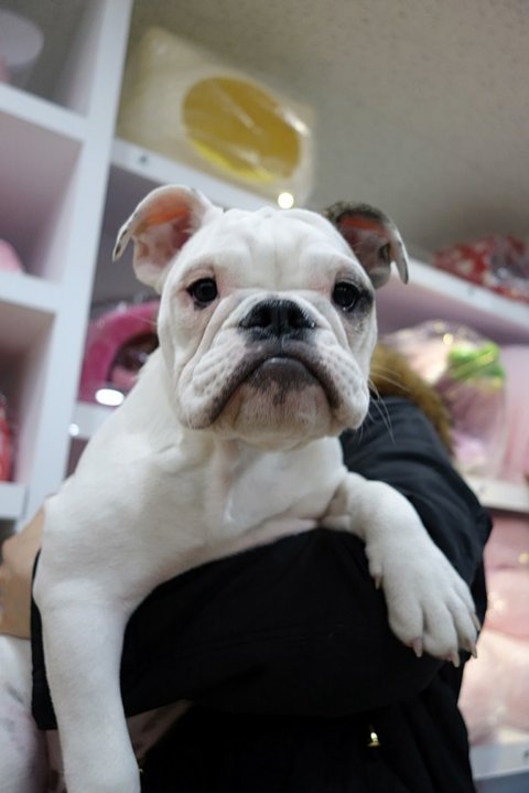 불독꼬마와 함께. 손님께 인사하고 있어요