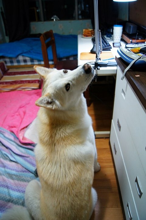 아침 일찍 일어나서 산책 가고 싶어서 거실에서 빤히 쳐다보고 있어요