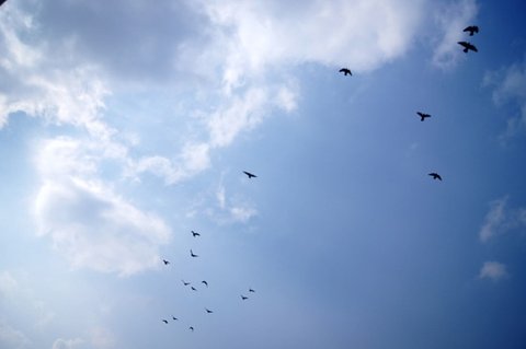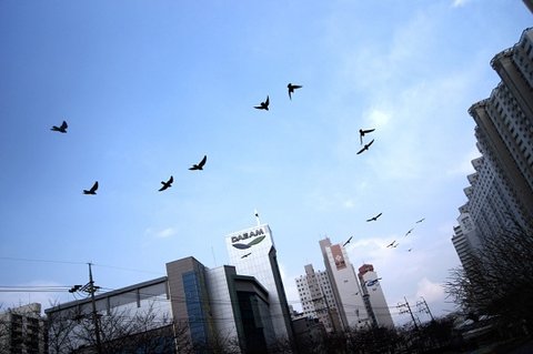 파란 하늘에 비둘기떼가 날아가고 있어요