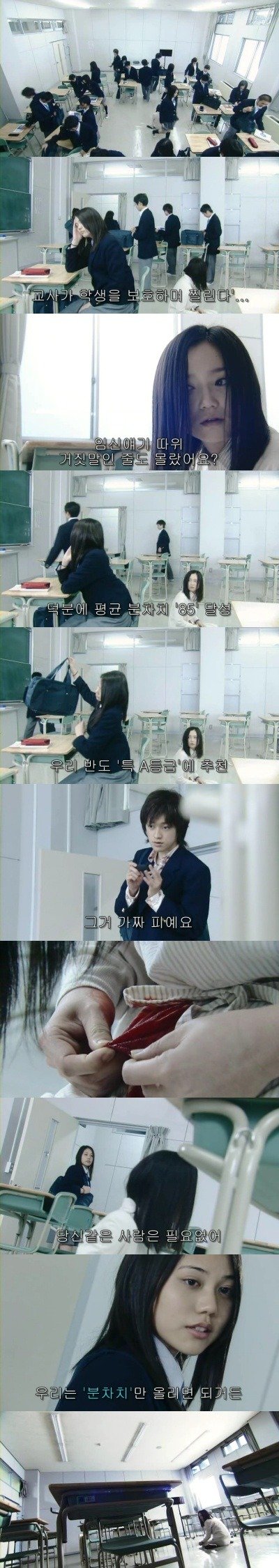 왕따학생의 책상에 잔인한 말들을 새겨넣어