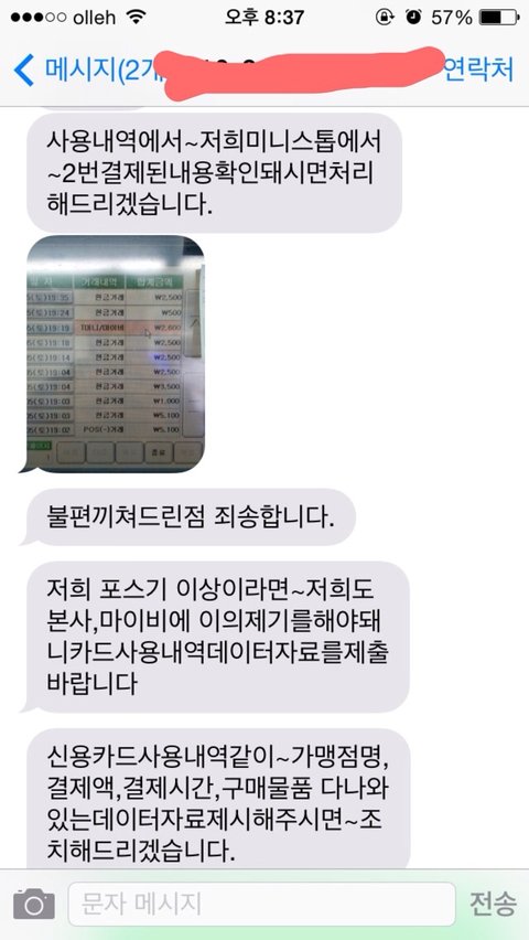 두번 결제가 된걸로 나왔습니다. 첨부한 이미지를 점장에게 문자로 보내 드리니