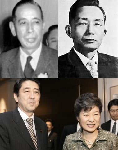 2차대전 A급 전범의 손자인 아베는 일제에 충성하겠다고 혈서를 쓴 황국장교 박정희의 딸이 대통령에 당선되는 걸 보며 크게 반색했을 것이다. 박근혜 정권 요직에 친일행각을 했던 이들의 후손이 촘촘히 박혀 있는 것을 보면서 얼마나 흡족했을까.