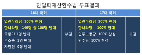 새누리당 자체가 친일옹호 집단이다. ‘친일재산환수법’ 제정이 논란이 됐던 16대 국회 때 열린우리당 의원들은 100%가 이 법안에 찬성한 반면 한나라당 의원 70%는 이 안에 반대했다. 2005년 제17대 국회에 다시 상정되자 한나라당은 당력을 총동원해 저지하려고 맞섰다. 당시 의석수가 많았던 열린우리당이 100% 찬성표를 던지며 가까스로 이 법안이 통과될 수 있었다. 물론 한나라당 의원은 한명도 빠짐없이 모두 반대표를 던졌다