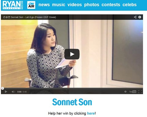 손승연은 미국 현지 시간으로 4월 5일, 미국의 대표적인 국민 MC 라이언 시크레스트(Ryan Seacrest)가 직접 운영하는 라이언 시크레스트 닷컴(http://www.ryanseacrest.com/)에서 진행 중인 ‘렛 잇 고’ 베스트 커버 영상 투표에서 최종 7명이 경합을 펼치는 파이널에 당당히 이름을 올렸다.