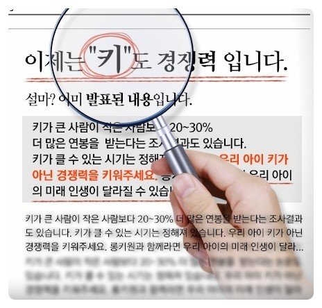 한 연구조사 결과에 따르면 키가 큰 사람일수록 사내에서높은 위치, 승진 확률이 높고 자연스레 키가 작은 사람보다 연봉도 더 많이 받는다결과가 있다던데요. 이처럼 "키" 도 경쟁인 시대가 왔습니다.키는 아무래도 어린시절 결정되는데요환경이 차지하는 비중이 크기때문에 부모님이조금만 신경써준다면 아이 키크는 가능성은 높아집니다.
