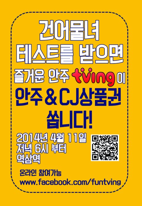 2. 행사 당일, 역삼역 부근의 행사부스를 찾아 건어물녀 테스트에 응시하고 100%증정의 상품도 받고, 대박 상품에도 응모한다!(두 가지 행사 모두 참여시 당첨확률up!) 일시 : 2014년 4월 11일 금요일 저녁 6시~8시 장소 : 역삼역