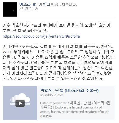 이와 함께 박효신은 "기다리던 소라 누나의 앨범이 드디어 11일 발매 되는군요. 2년 전 W.I.O 무대 위에서 누나가 해줬던 말, 그때의 그 말들과 누나의 모습은 아직도 제 가슴을 뜨겁게 해주는 소중한 추억으로 남아있습니다.