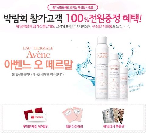 첫번째, 방문사은품 건조한 내 피부에 촉촉함을 선사할 아이템은 뭐지?웨딩박람회 참가고객 선착순 2,000명에게 '아벤느 오 떼르말 미스트' 증정플러스! 롯데면세점 VIP할인쿠폰, 고급웨딩다이어리, 2014년 최신 웨딩잡지 특별판