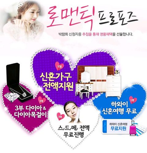 둘째, 추첨 이벤트더 많은 고객에게 좋은 혜택을 드리고 싶은 아이니!아래와 같이 추첨이벤트 진행합니다.1) 신혼가구 전액지원 2) 3부 다이아 & 다이아목걸이 3) 하와이 신혼여행 무료 4) 스드메 전액 무료진행