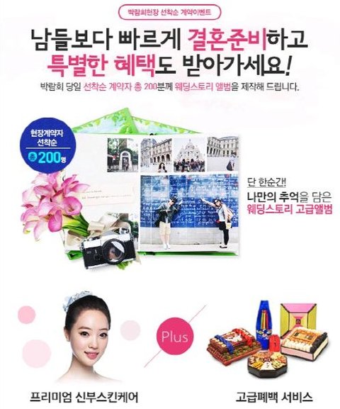 셋째, 계약 혜택2014년결혼박람회 당일 계약자 분들에게 3가지 특별 계약 혜택을 제공합니다~ 웨딩스토리 고급앨범 제작 / 25만원 상당의 스페셜 신부스킨케어 (물광&도자기& 청담동 연예인 케어) 35만원 상당의 고급폐백 서비스