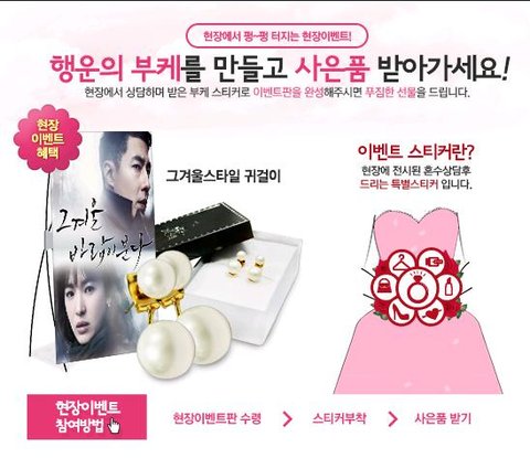 넷째, 현장이벤트상담후 업체에서 전달받은 스티커를 부착해주세용~~스티커판을 완성하면 송혜교표 진주귀걸이(그겨울 바람이분다) 증정합니다!!! 귀걸이를 하는 순간 우리 신부님들은 송혜교가 되는것! ㅎㅎ