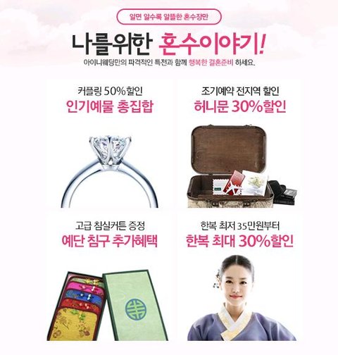 다섯째, 혼수혜택아이니웨딩박람회에서만 만날 수 있는 파격적인 할인혜택입니다.커플링 50%, 허니문 30%, 한복 30%, 고급 침실커튼 증정!!!!