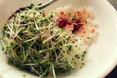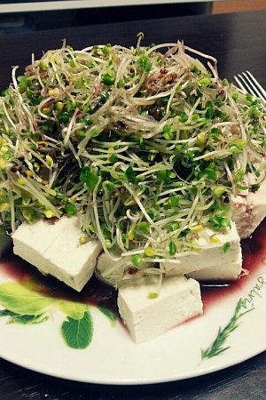 두부위에다가 새싹채소 올리고 소스뿌리면