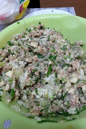 고기랑 당면, 양파랑, 부추 열심히 다져서 넣고