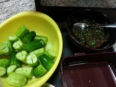 소금에 절여두었던 오이에 칼집을 내고 양념을 집어넣고
