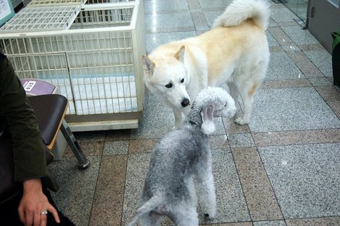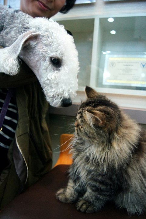 병원에 온 베들링턴 테리어와 인사하고 있어요
