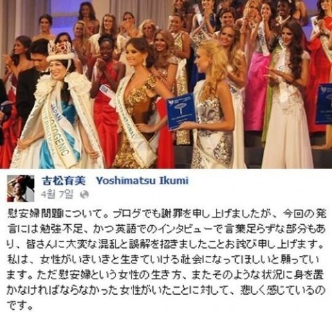 '2012년 미스인터내셔널'에서 1위를 한 일본인 요시마쓰 (吉松育美·26·)가 일본군 위안부 망언을 비판했다가 곤경에 빠졌다. 미국 라디오 방송에 출연해 우익 인사들의 위안부 망언을 비판한 사실이 뒤늦게 알려져 일본에서 비난받고 있기 때문이다.