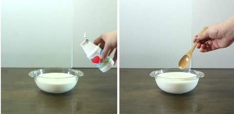 3. 적당히 데워진 우유에 유산균 음료를 넣어주세요.