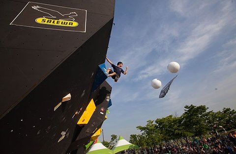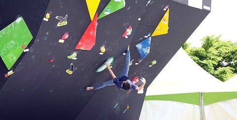 인공 볼더링 암벽에서 대회가 정한 규정에 따라 문제를 풀어야 합니다.