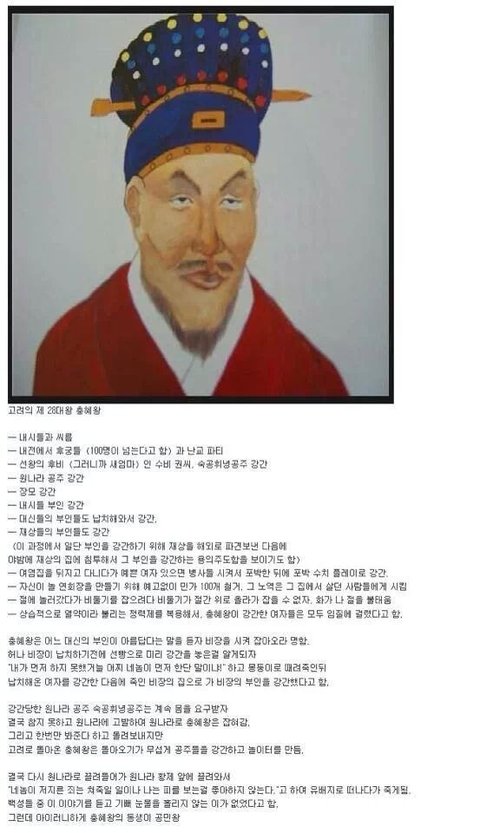 이민호 김희선 주연의 '신의'라는 드라마를 보시면 과거 이야기에 충혜왕이 나옵니다. 변태거지발싸개로 나오죠. 그게 맞는 겁니다.