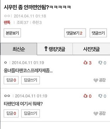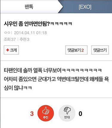 열심히 쉴드치고 화 가라앉히면서 지금까지 참을인자 몇백번을 써왔었는지...근데 오늘 처음으로 눈물이 난다.염산드립 없어져버렸으면 좋겠다는 글들 봤을땐 화가 치밀어 올라서 전투능력상승되었었는데저글보니 참... 힘이 빠져 버리네 저런 말을 하는 사람이 시우민팬이라는 댓글에 추천수는또 뭐니......