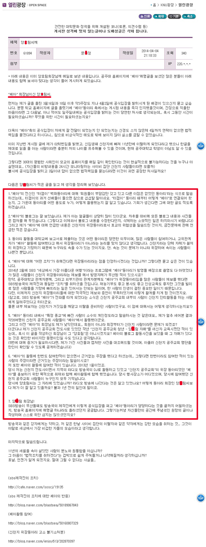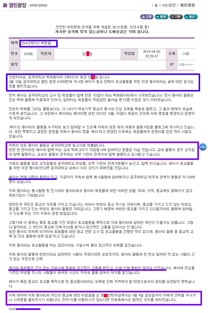 게시물 제목 공주대에서 활동하는 “신천지”를 아십니까? 사유 명예훼손 / 기타권리침해 (게시물에 포함된 내용으로 인한 피해를 주장하는 단체로부터 게시중단 요청 접수) 요청자 쎄아 일자 2014년 04월 07일