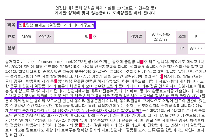 다음은 문0정 전 신천지 전도사가 공주대 열린마당에 적은 글과