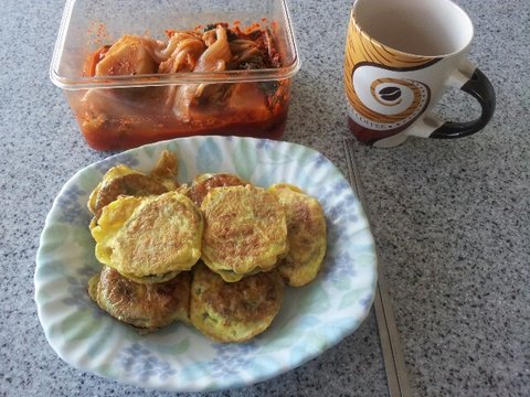 2. 야식으로 먹고 남은 김밥을 아침에 계란에 풀어서 부친다