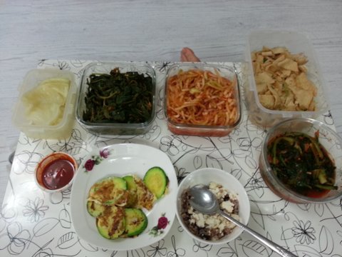 그리고 양배추삶은거, 엄니가싸주신 나물, 무생채, 어묵볶음( 끓는물에 기름빼고 조리), 김치