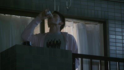 여자는 요리를 만들고 남자는 잠깐 베란다로 나와 음료수를 마십니다