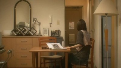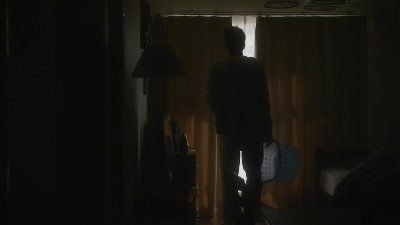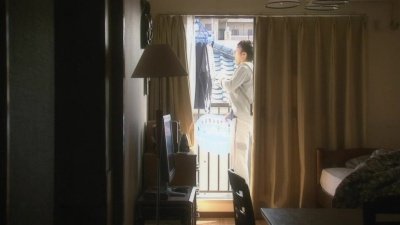 빨래를 다 널은 남자는 방으로 다시 들어가고
