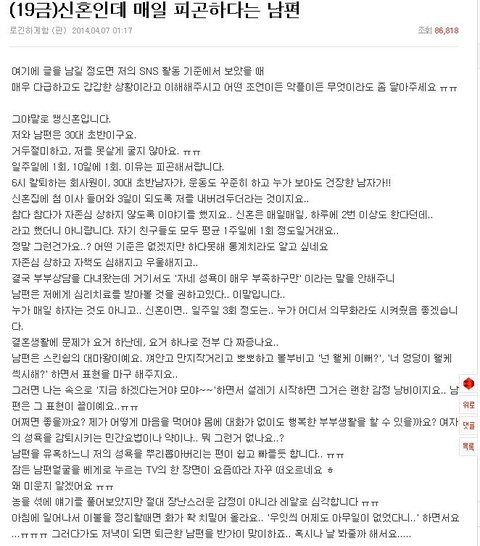 남자나 여자나 결혼 후에 상대방이 본인 성욕에 못 맞춰주는 것처럼 답답한것도 없다. 여자는 성욕 많으면 안되는가? 사람인데? 남자이지만 유교사상에 갇혀서 여자 성욕 많은걸 부정적으로 보고 이렇게 조롱거리로 만드려는 이 포스팅 업로더가 한심하다.