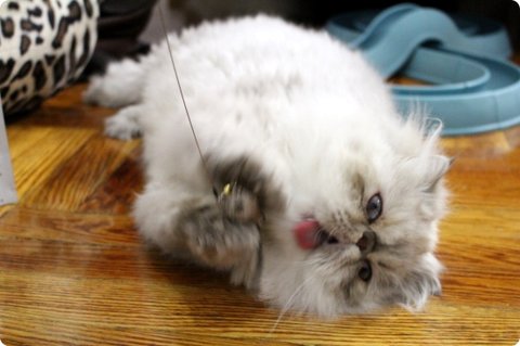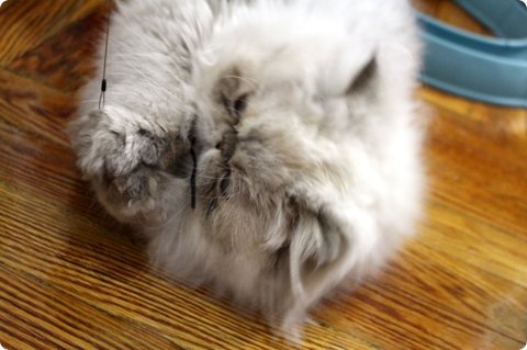 녀석 진짜도 아닌 쥐돌이에게 침을 덕지덕지 묻히려 하고 있습니다.