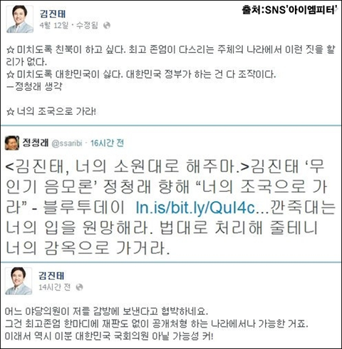 새누리당 소속 김진태 의원과 새정치민주연합 소속 정청래 의원이 SNS상에서 거친 설전이 벌어졌습니다. 김진태 의원은 SNS에 "미치도록 친북이 하고 싶다. 최고 존엄이 다스리는 주체의 나라에서 이런 짓을 할 리 없다. 미치도록 대한민국이 싫다. 대한민국 정부가 하는 것은 다 조작이다= 정청래 생각"이라는 글을 올렸습니다.