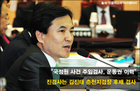 김진태 의원은 국정원 댓글 의혹 사건이나 국정원 간첩조작 사건에서 유독 국정원의 주장과 그들의 편을 들어준 인물입니다. 특히 김진태 의원은 국정원 사건의 주임검사가 '운동권 출신'이라며 검찰의 국정원 수사와 국정조사를 계속 파행으로 이끌었습니다.