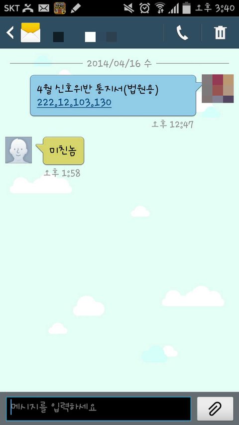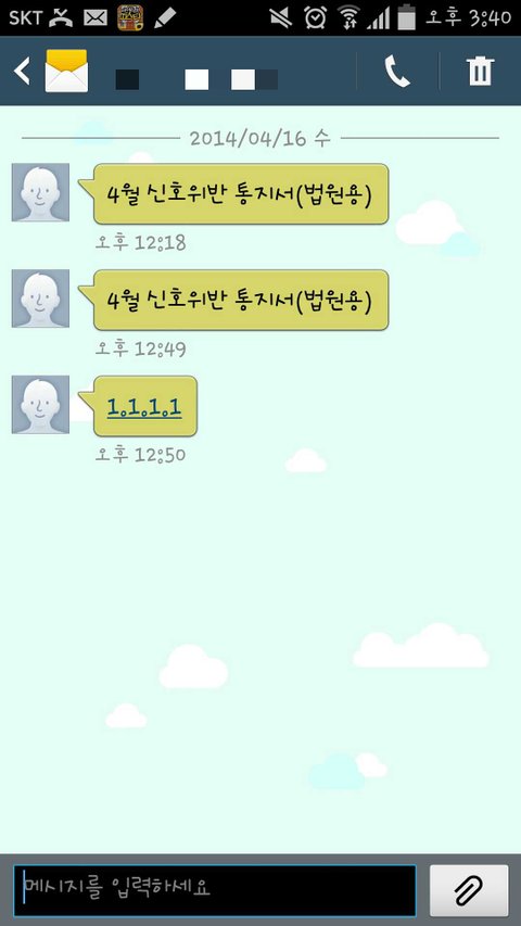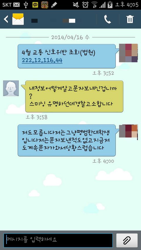 신호 위반 문자를 제가 보낸 문자더라구요.저는 보낸적도 없고 모르는 번호를 제가 어떻게 알겠습니까.그런 문자가 거의 40통 가까이 다다른 번호로 보내졌습니다.