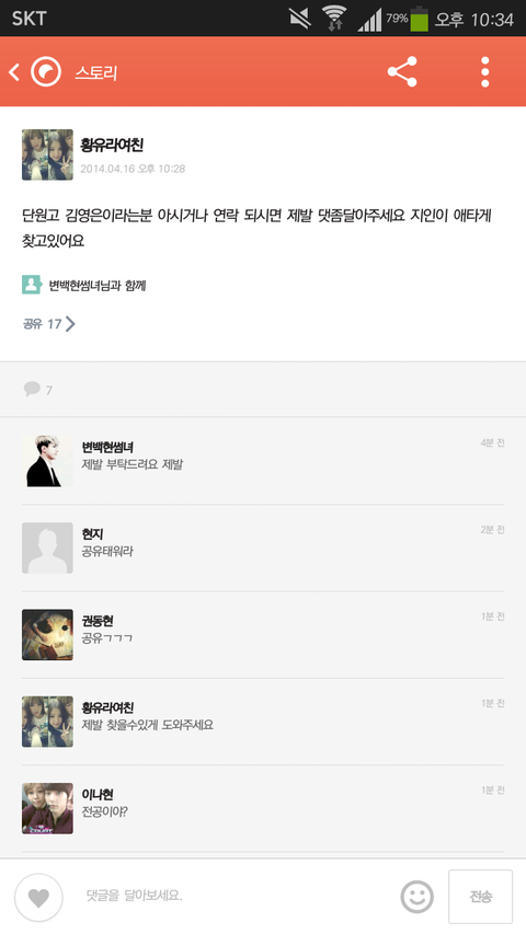 제친구 지인이 김영은양을 애타게 찾고있습니다..