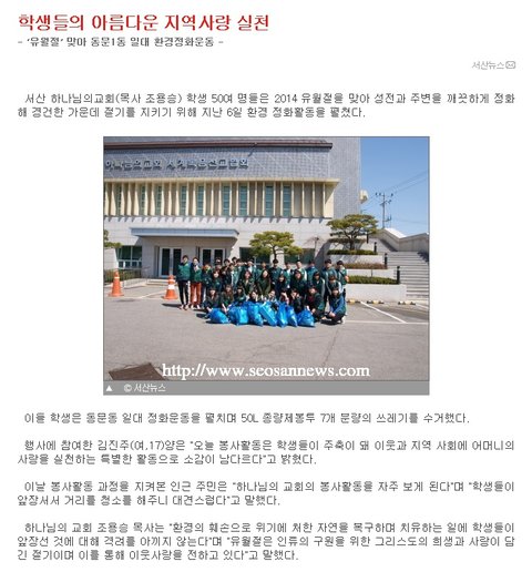 서산뉴스 하나님의교회 학생들의 아름다운 지역사랑 실천