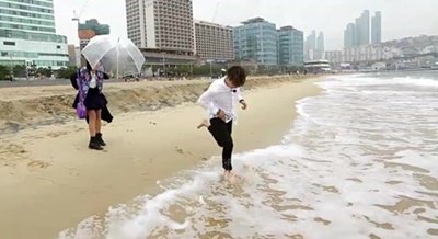 비오는 해운대에서 둘이 팔짱끼고 걷는데