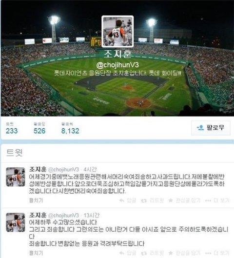 롯데 자이언츠의 조지훈 응원단장이 사려깊지 못한 응원과 사과로 네티즌으로부터 눈총을 샀다.