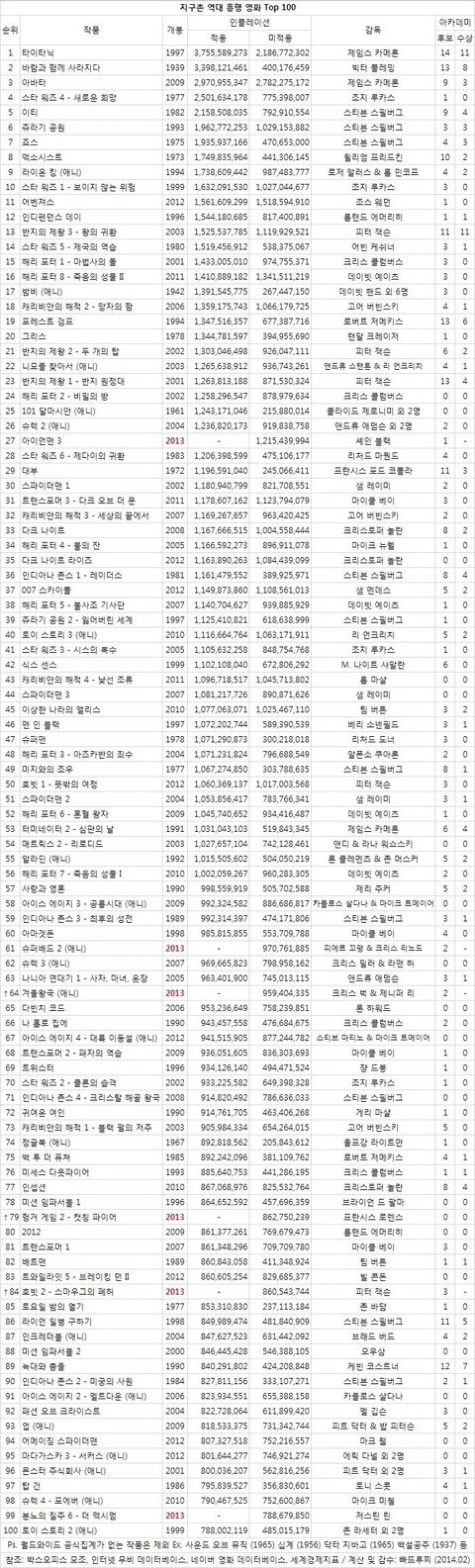 지구촌 역대 흥행영화 BEST100