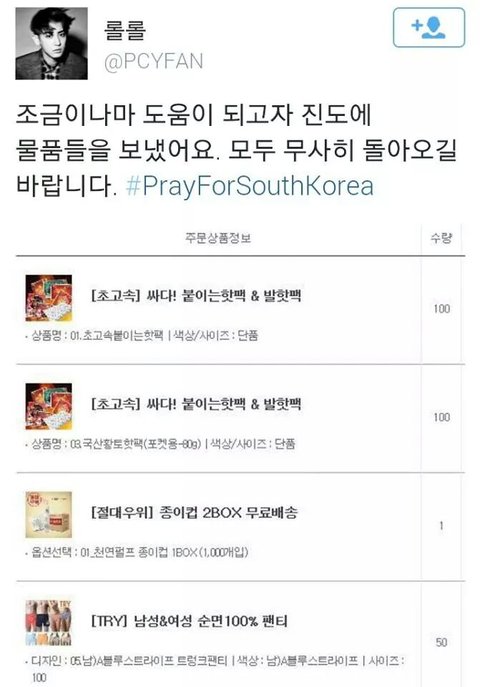 그리고 보다싶이 팬들이 세월호사건을 애도하며 구급물품을 보냄.......