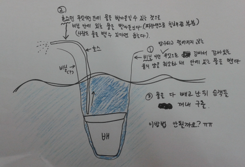 비닐 안의 배 밖에 있는 바닷물부터 호스로(물을 빨아들일 수 있는 다른 기구가 있다면 추천)
