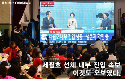 18일 오전 학부모들이 있는 진도체육관 TV에 세월호 내부 진입에 성공했다는 화면이 나왔습니다. 그러나 이것은 오보였습니다.