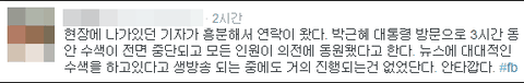언론사 기자가 현장기자의 소식을 트위터에 올린 글에는 '대통령 방문으로 3시간 동안 수색이 전면 중단됐다'는 말이 나옵니다.