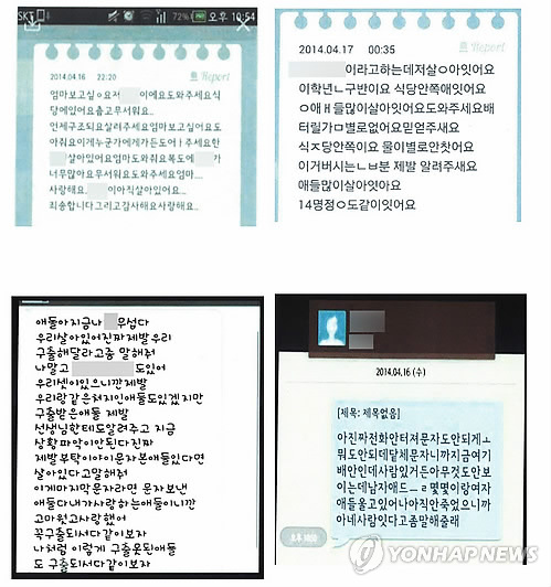 ↑ 경찰 "SNS '살아 있다' 메시지는 가짜" (서울=연합뉴스) 전남 진도 인근 해역에서 침몰한 여객선 '세월호' 생존자가 여객선 속에 살아 있으며 구조를 요청하고 있다는 내용으로 떠돈 SNS 상 메시지는 모두 사실이 아닌 것으로 판명됐다. 사진은 경찰이 허위로 확인한 SNS 메시지.